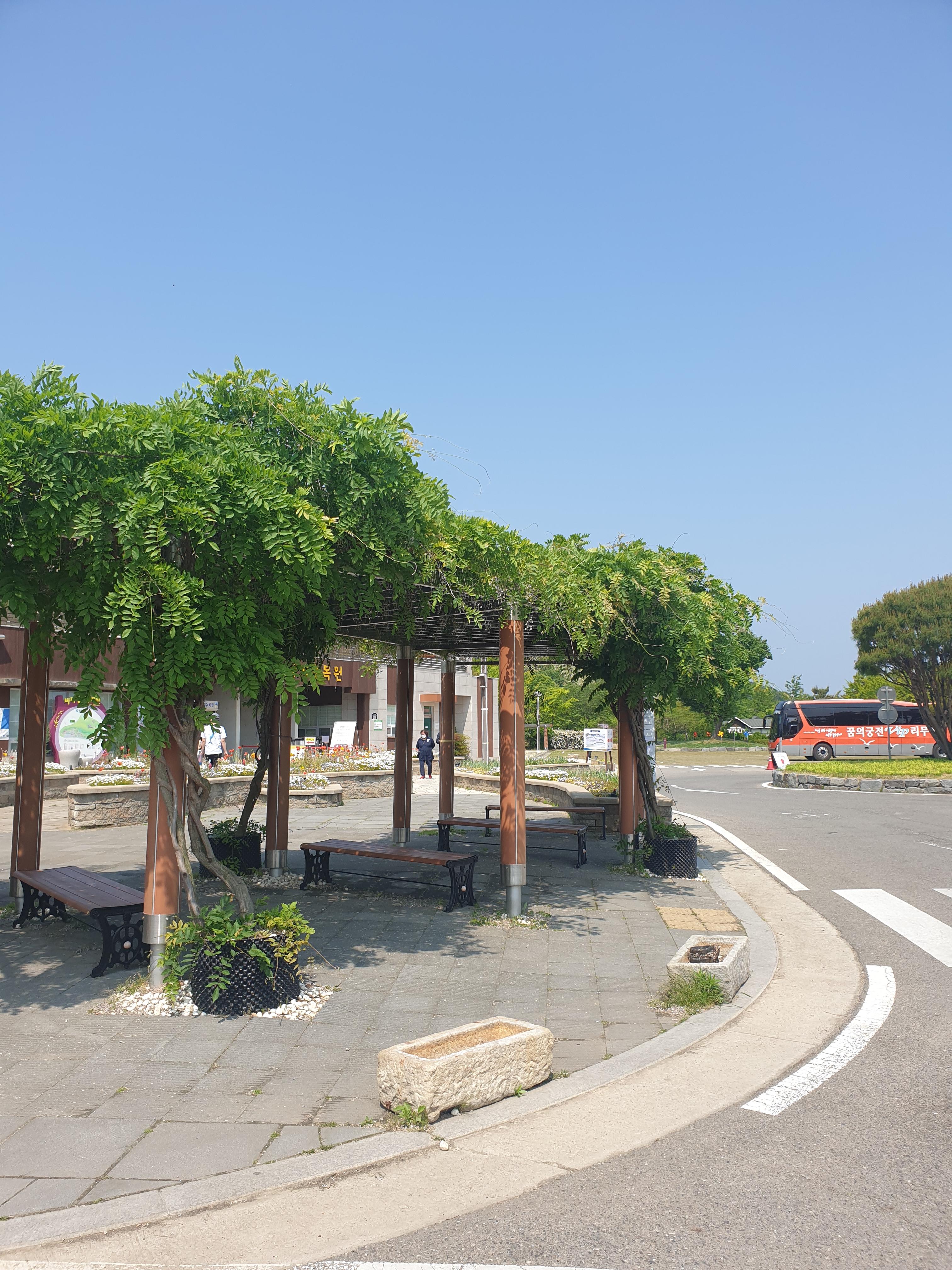 그늘  밑에 벤치 2개가 설치되어 있어서